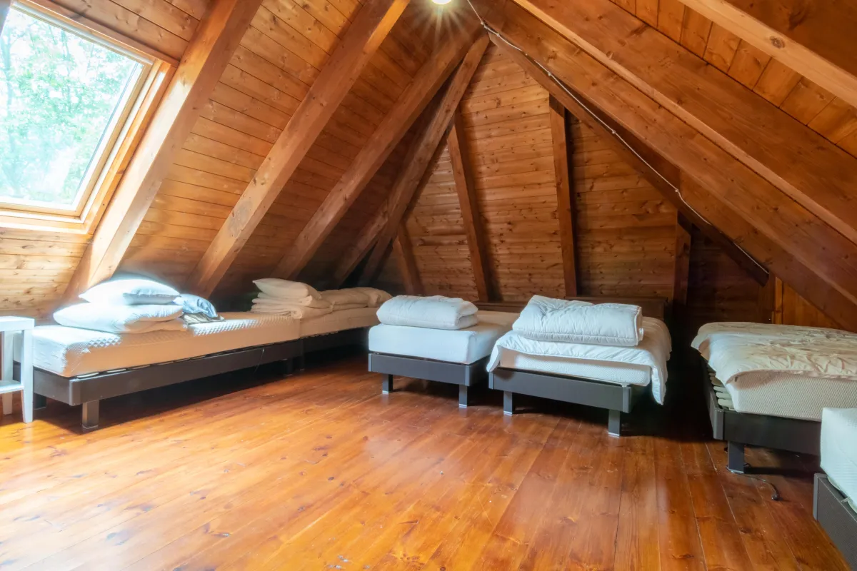 Planta superior: dos zonas comunicadas por pasarela que se pueden configurar como dormitorios múltiples (capacidad hasta 6 camas en cada lado) y baño completo.