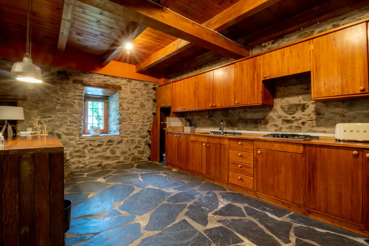 Planta de acceso: gran salón-comedor con cocina abierta totalmente equipada, dos chimeneas (una abierta para brasa interior; otra con sistema de calefacción de leña), y aseo.
