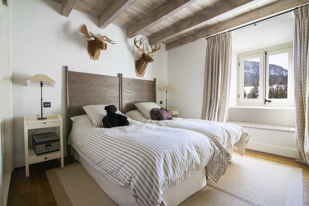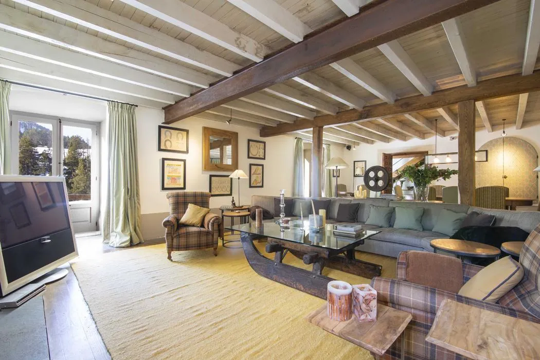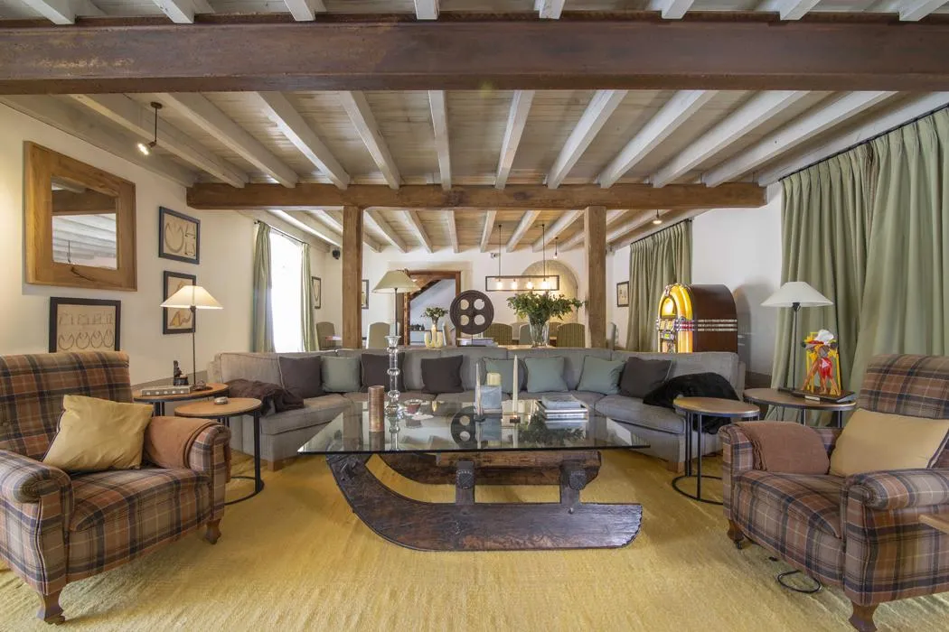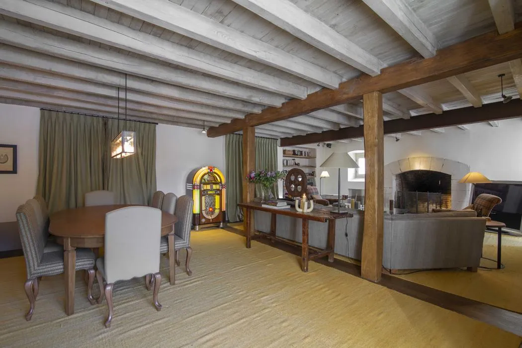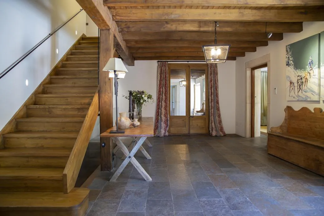 La residencia principal, distribuida en 4 plantas, ofrece ~754 m² (área utilizable ~629 m²) con 7 dormitorios y 9 baños. Los espacios de día combinan salones con chimenea, comedor y salidas a terrazas y jardines con vistas abiertas a la montaña. Los acabados —como los suelos de parquet— aportan calidez y elegancia alpina.