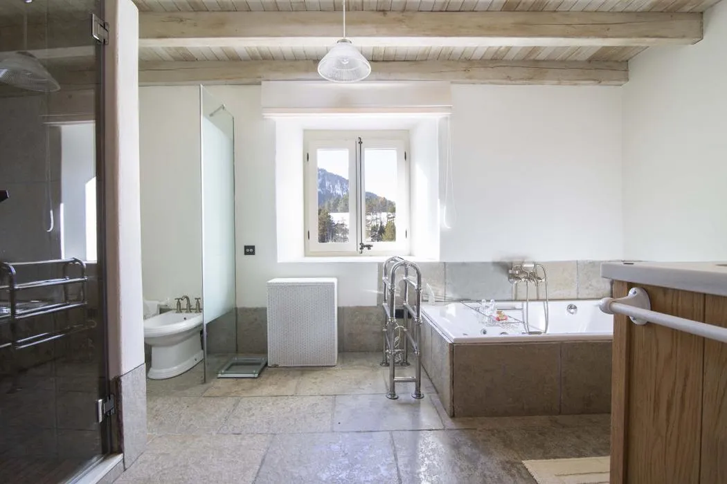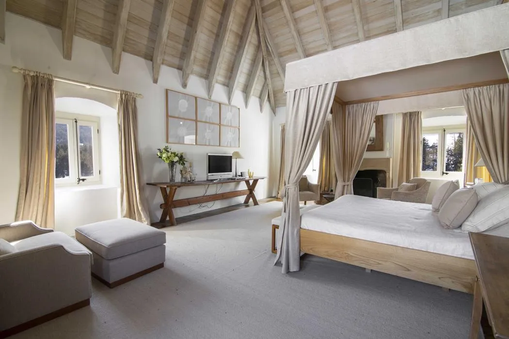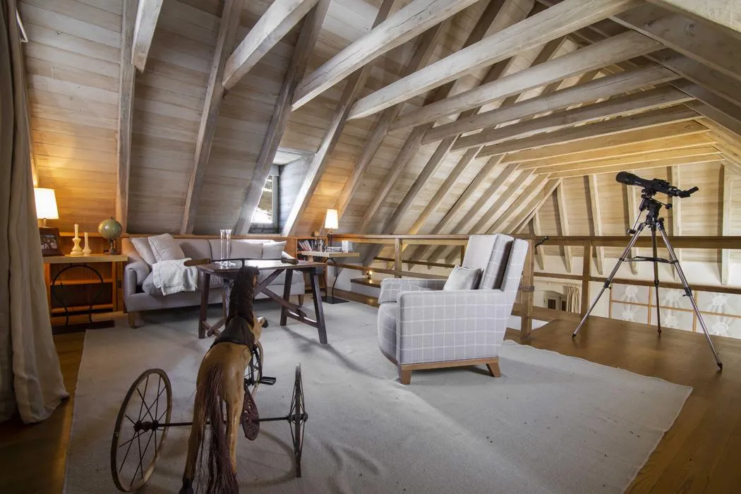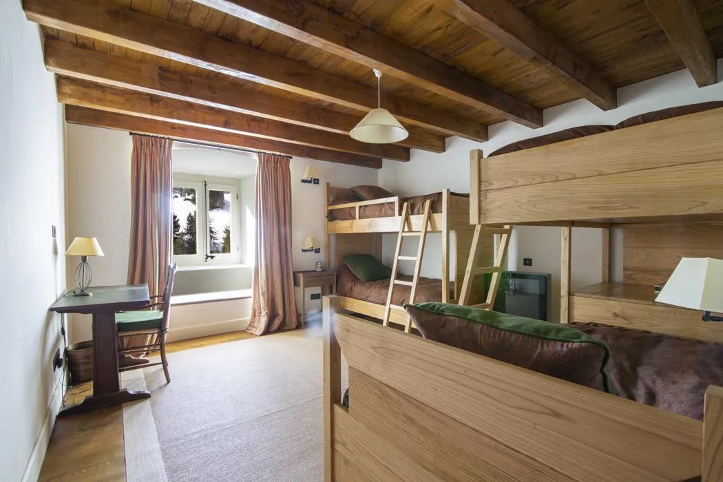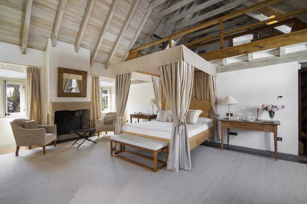 La residencia principal, distribuida en 4 plantas, ofrece ~754 m² (área utilizable ~629 m²) con 7 dormitorios y 9 baños. Los espacios de día combinan salones con chimenea, comedor y salidas a terrazas y jardines con vistas abiertas a la montaña. Los acabados —como los suelos de parquet— aportan calidez y elegancia alpina.