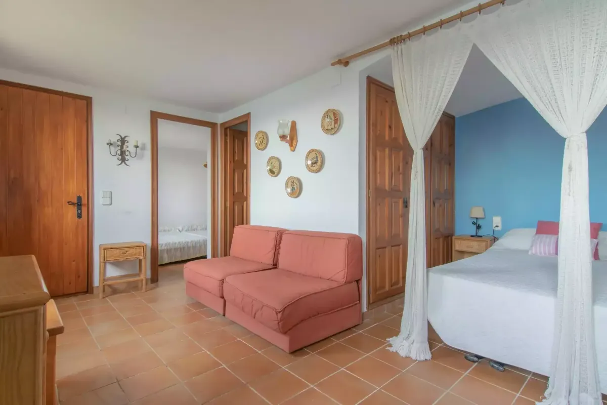 La residencia principal recibe con un porche señorial y un hall que distribuye el área de día: salón con chimenea enmarcado por un gran ventanal al Mediterráneo, comedor elegante y cocina equipada con acceso directo a los espacios exteriores. La misma planta, a media altura, alberga dos dormitorios en suite con baño privado. En la planta superior se ubican dos dormitorios adicionales y un baño completo.