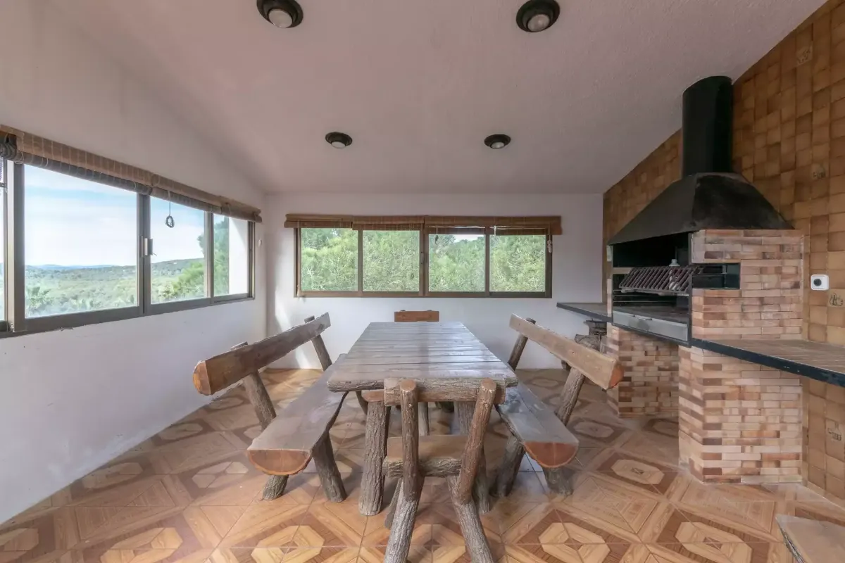 El exterior es un verdadero mirador mediterráneo: piscina de gran tamaño rodeada de solárium y terrazas con vistas, zona de barbacoa contigua a la cocina y espacios ajardinados con rincones de sombra. La topografía y los múltiples niveles de terraza permiten disfrutar de los exteriores todo el año.